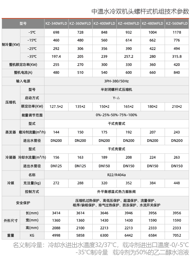 ◆中溫雙機頭螺桿機組是采用螺桿式壓縮機提供制冷動力源,以冷卻水塔作為冷凝介質,雙機頭輸出馬力220HP~560HP。出水溫度控制范圍-15℃~-25℃.