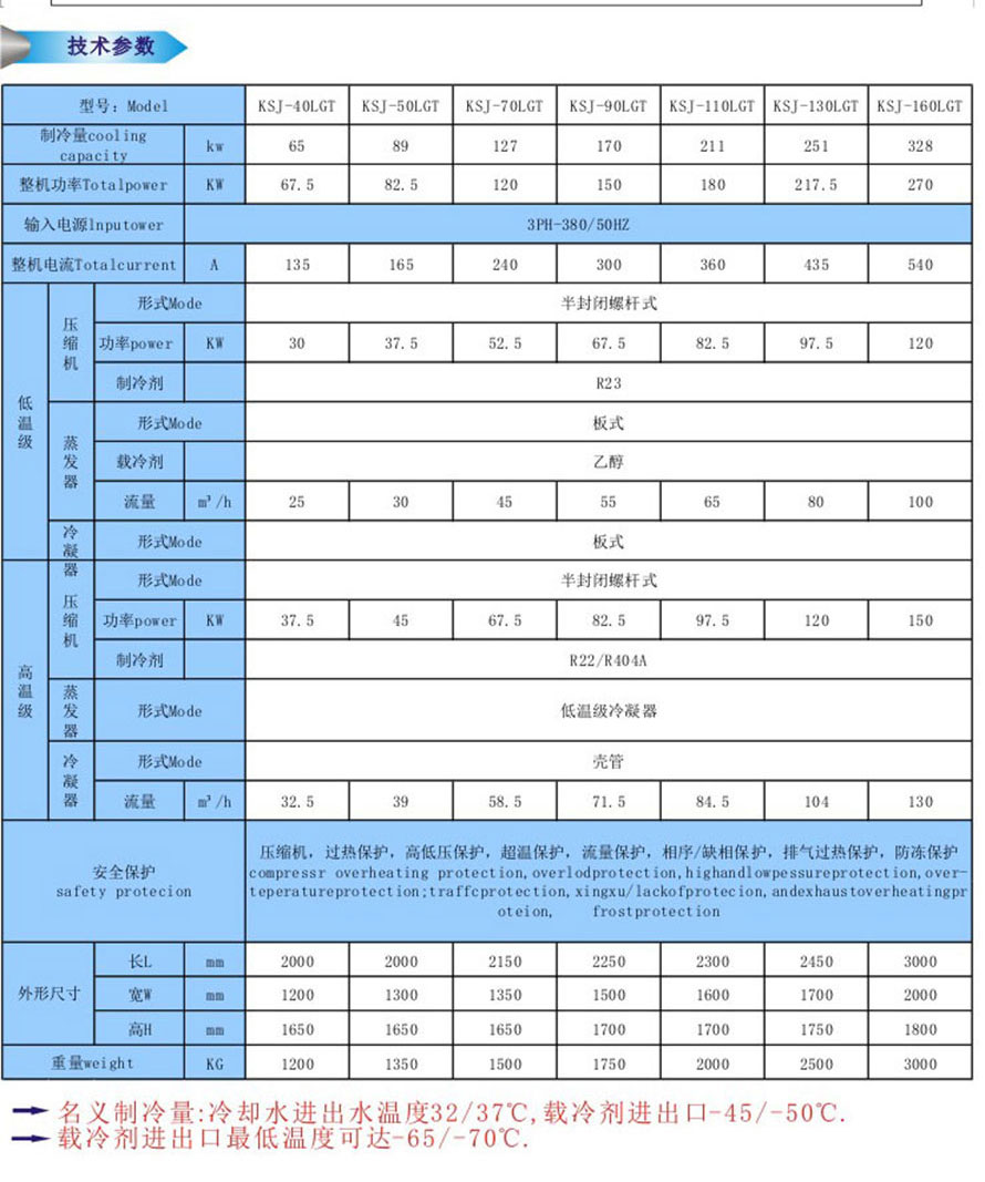 2.三元復(fù)疊低溫冷水機(jī)組:其由高溫級(R404A/R22)、低溫級R23、超低溫級(R14)組合而成,低溫可提供-120℃超低溫工藝?yán)湓础C(jī)組制冷量范圍為3kw~300kw;