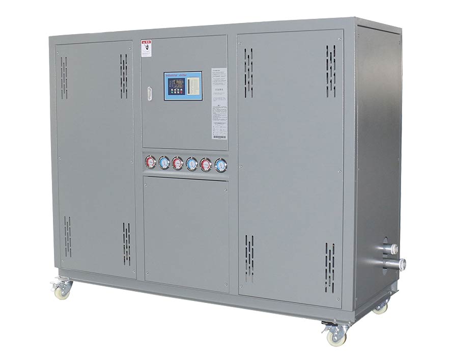 2、水冷式壓延機冷水機,通過冷卻塔以冷卻循環水為冷凝方式的控溫設備,有箱式和螺桿式;